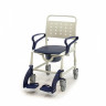 Легко транспортируется и чистится, имеет откидные подлокотники и выдвижную подножку, регулируемую по глубине и складывающуюся под шасси для облегчения перемещения. Кресло имеет удобное широкое сидение из гигиенического пластика, легко дезинфицируется и приятно на ощупь. Туалетное ведро в комплекте.