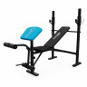 Расстояние между стойками в 55.5 см позволяет использовать самые разные виды штанг. В комплекте идут специальные валики, которые можно использовать как для жима руками, так и для жима ногами. Цвет спинки скамьи - ярко-голубой. Четырёхпозиционная спинка регулируется по углу наклона, что позволяет настроить тренажер под индивидуальные особенности пользователя и выполнять самые разные упражнения.